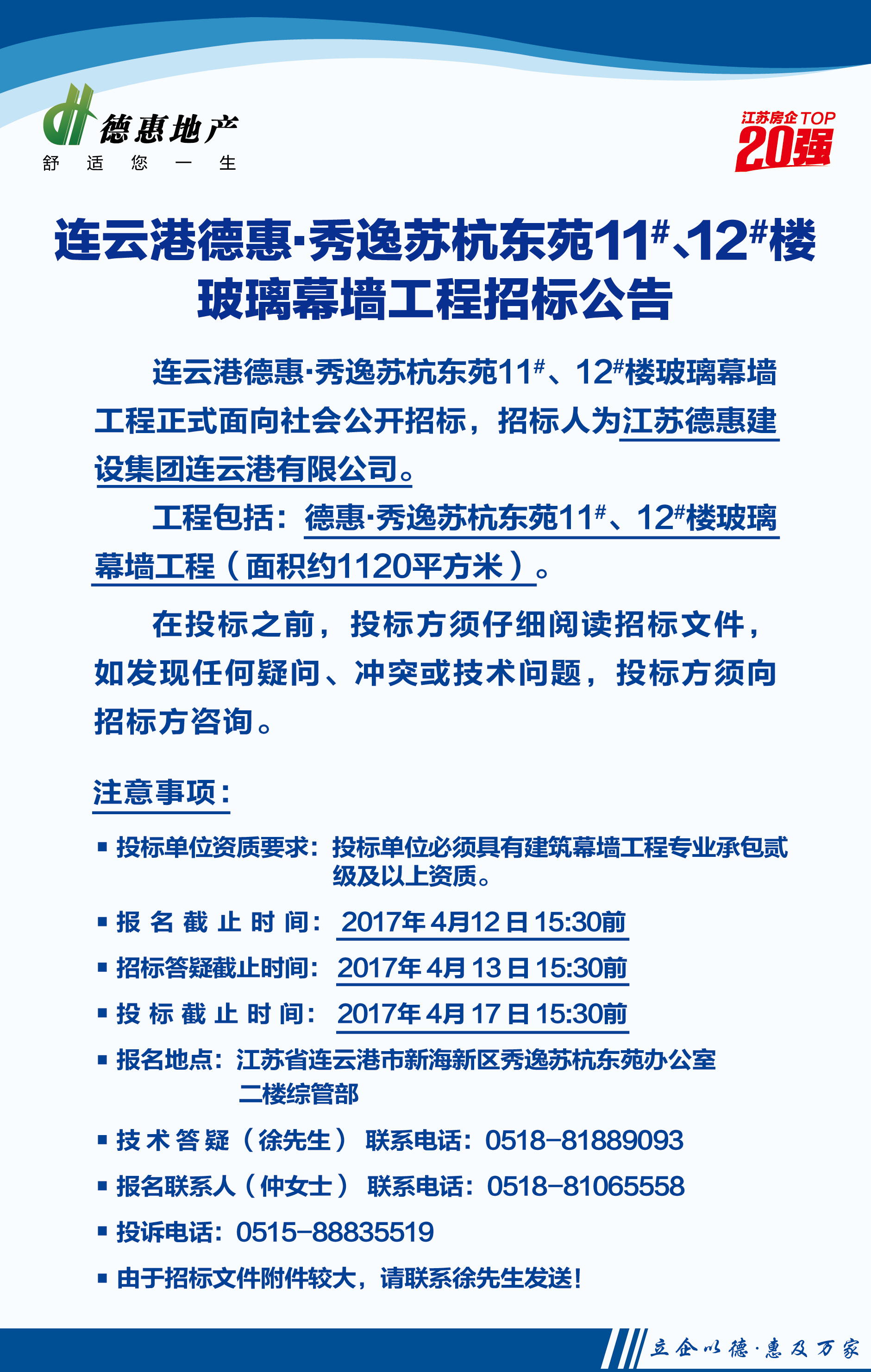 连云港德惠•秀逸苏杭东苑11#、12#楼玻璃幕墙工程招标公告