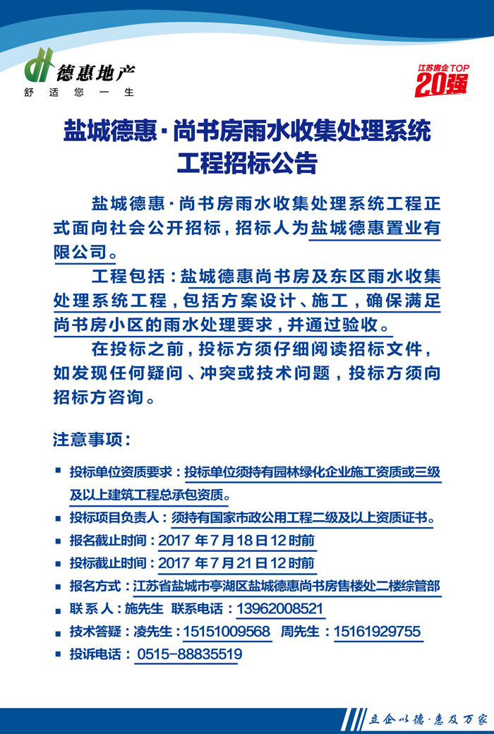 盐城德惠•尚书房雨水收集处理系统工程招标公告