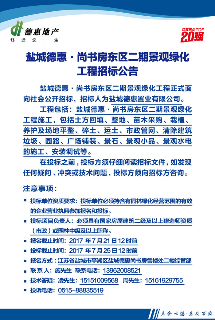盐城德惠·尚书房东区二期景观绿化工程招标公告