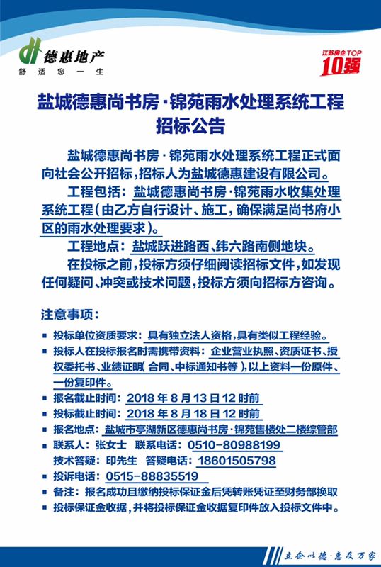 盐城德惠尚书房•锦苑雨水处理系统工程招标公告