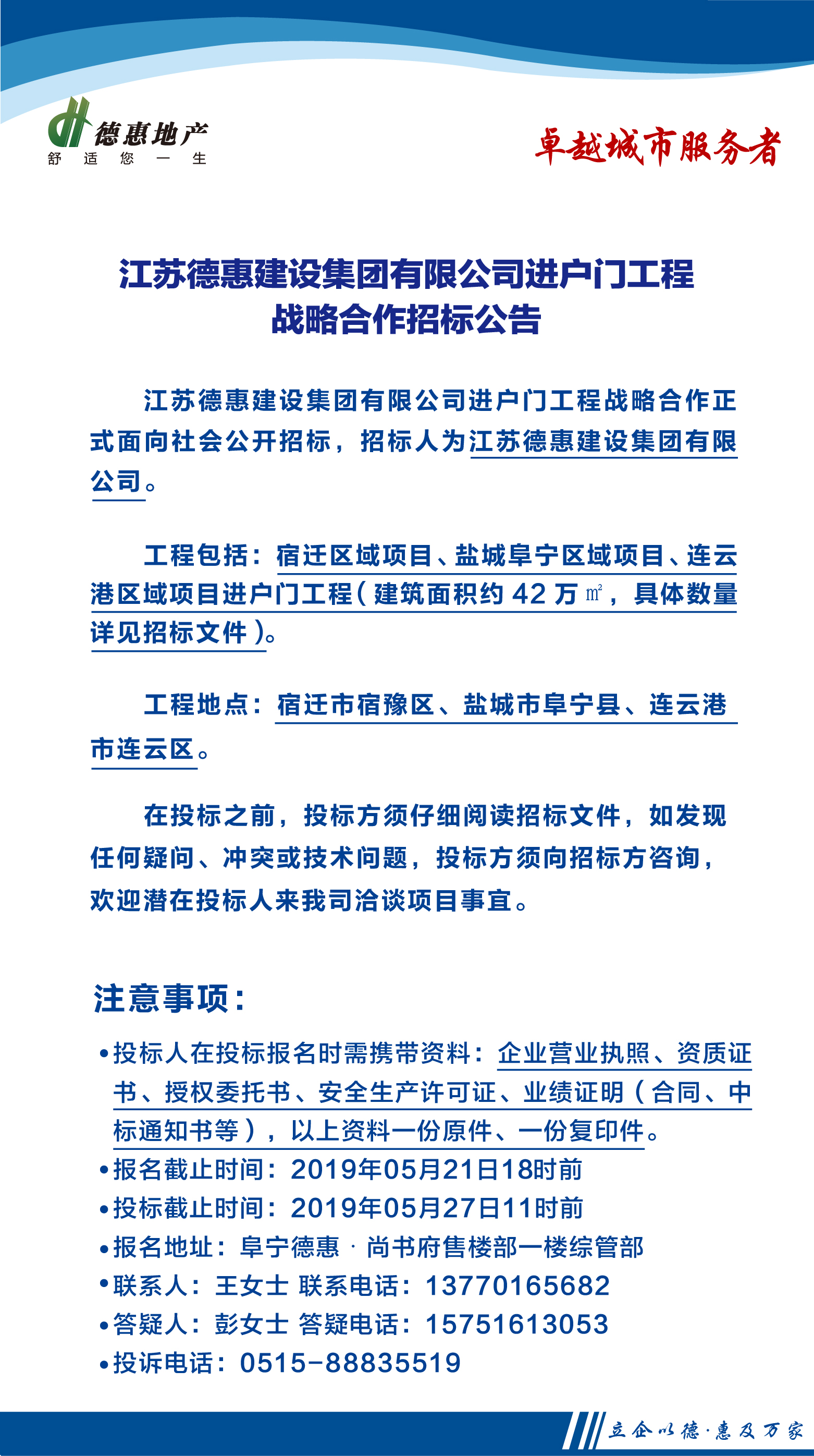 江苏德惠建设集团有限公司进户门工程战略合作招标公告