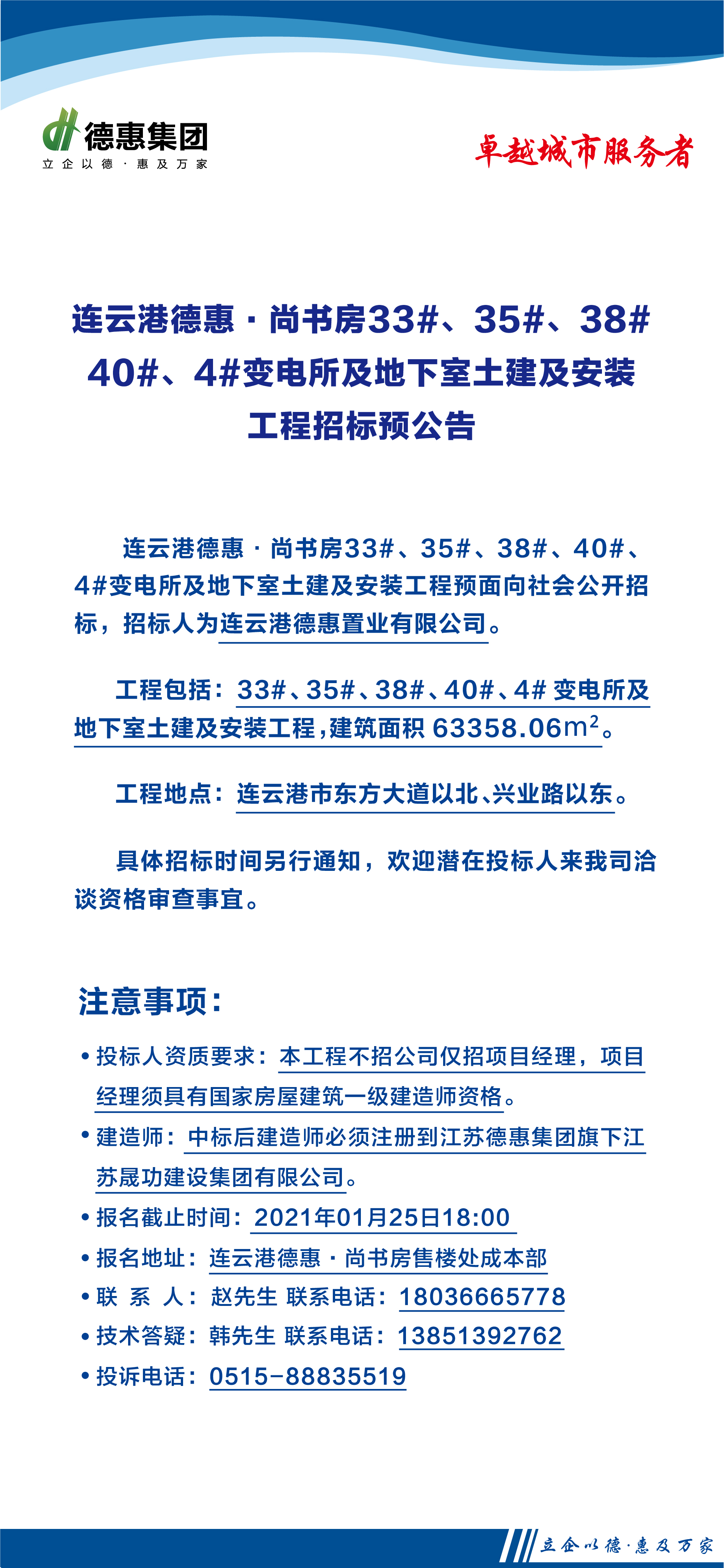 连云港尚书房33#、35#、38#、40#、4#变电所与地下室土建及安装工程招标预公告