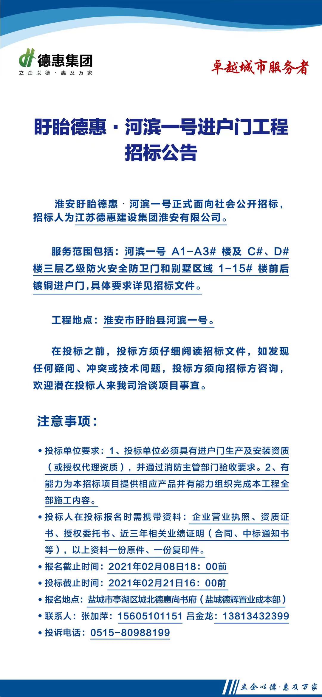 盱眙德惠·河滨一号进户门工程招标公告