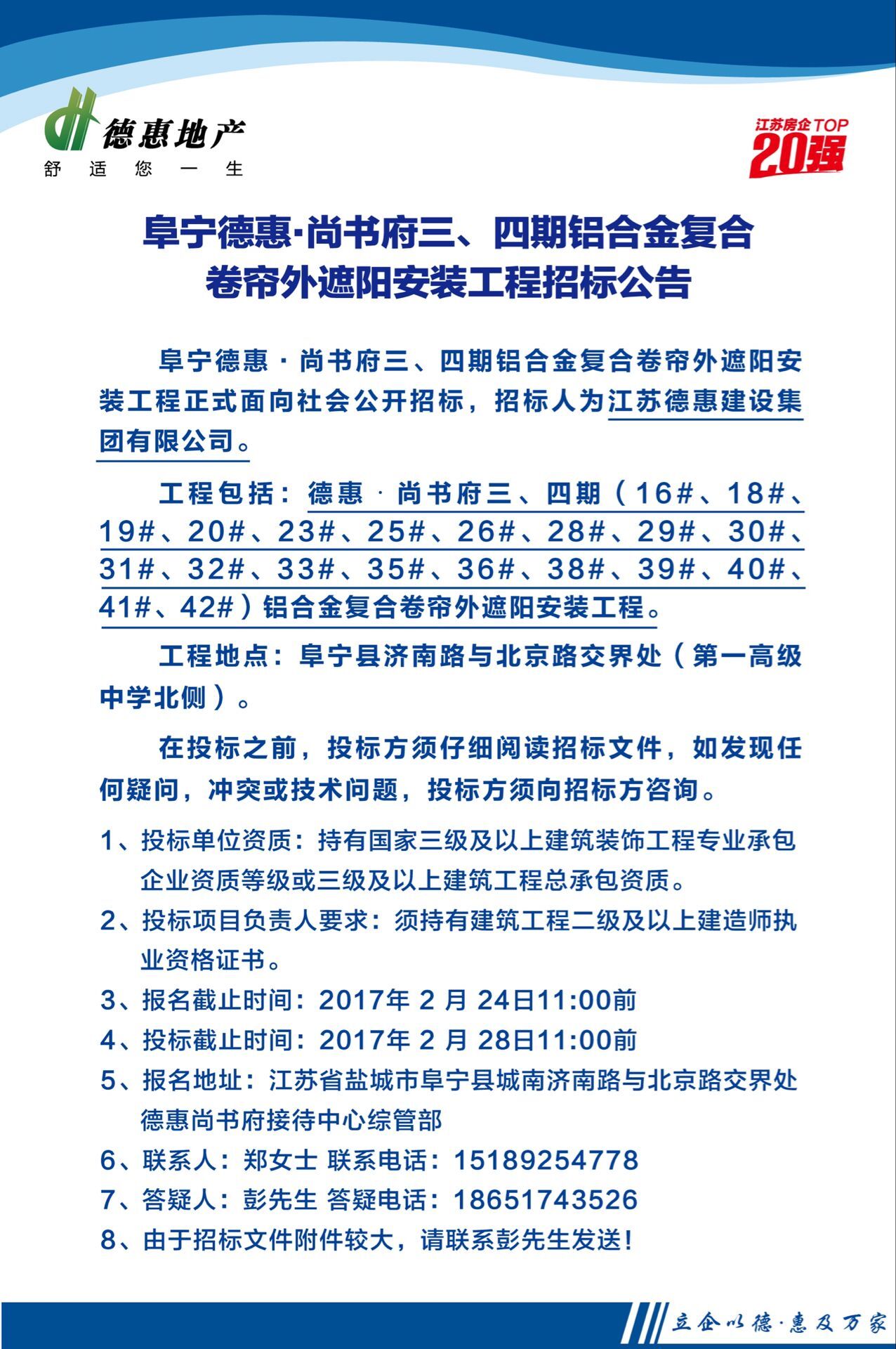 阜宁德惠尚书府三、四期铝合金复合卷帘外遮阳安装工程招标公告
