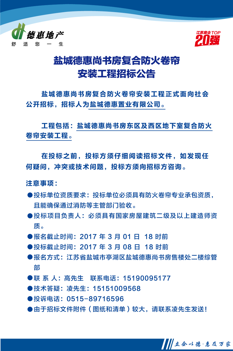 盐城德惠尚书房复合防火卷帘安装工程招标公告
