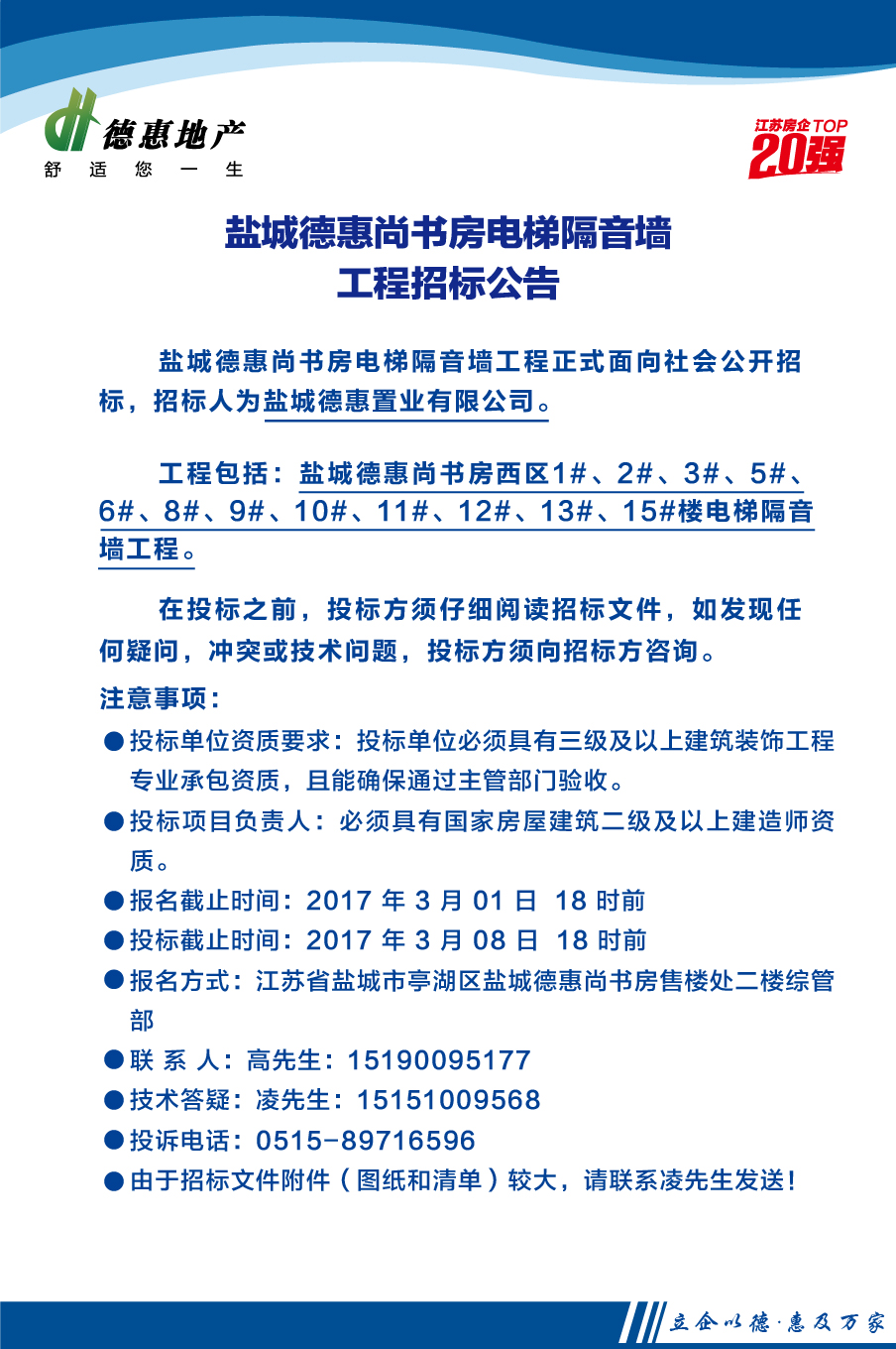 盐城德惠尚书房西区电梯隔音墙工程招标公告