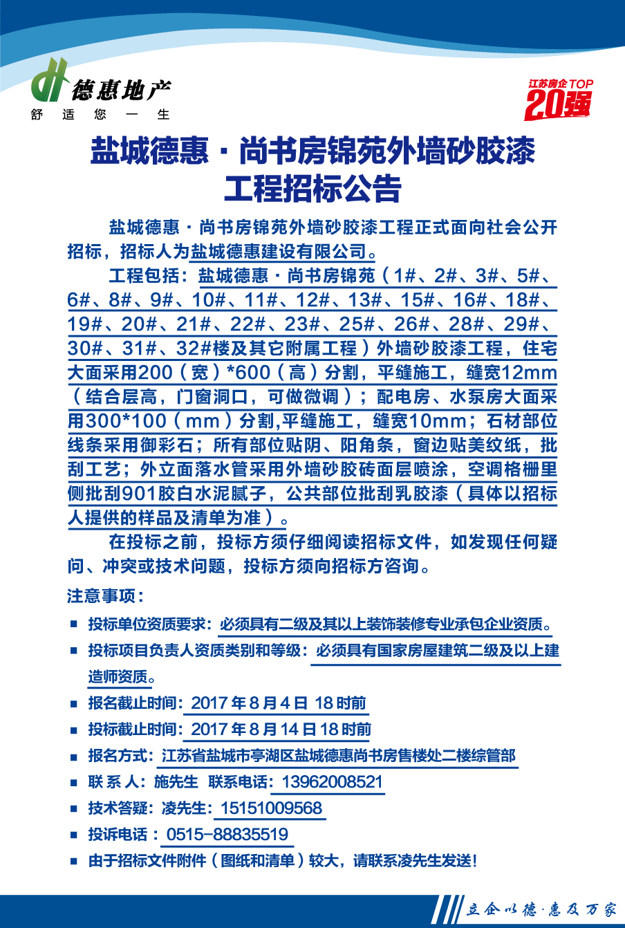 盐城德惠•尚书房锦苑外墙砂胶漆工程招标公告
