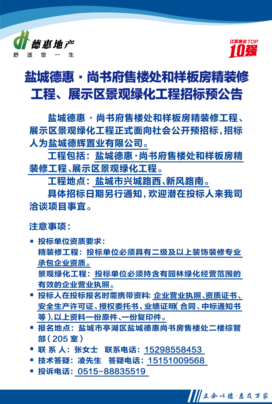 盐城德惠·尚书府售楼处和样板房精装修工程、展示区景观绿化工程招标预公告