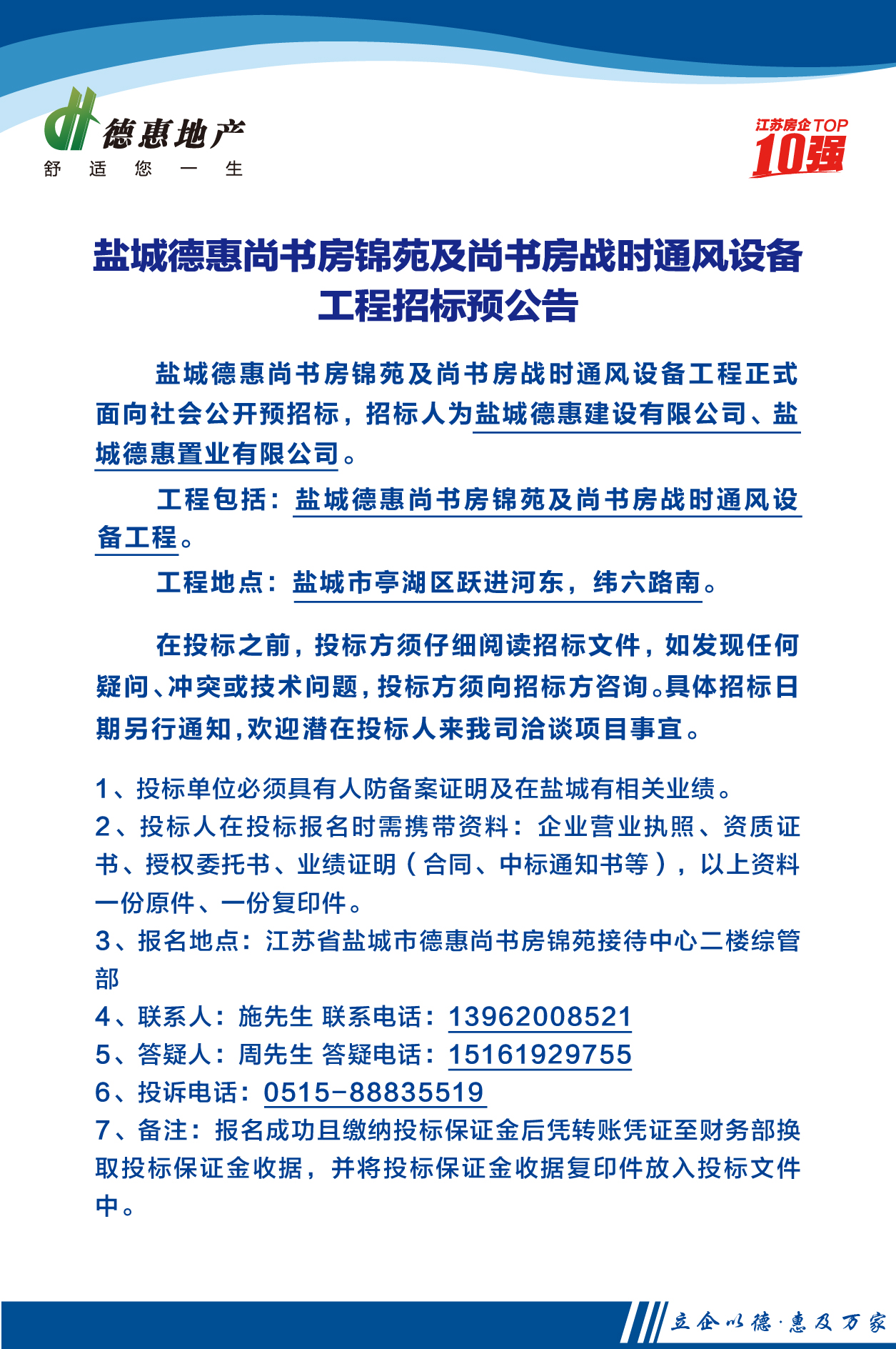 盐城德惠·尚书房锦苑及尚书房战时通风设备工程招标公告