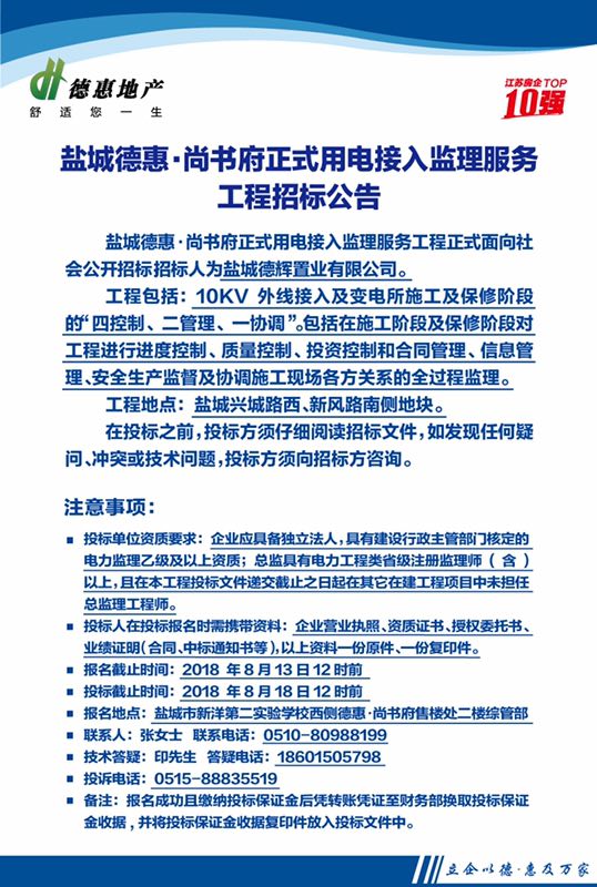 盐城德惠·尚书府正式用电接入监理服务工程招标公告