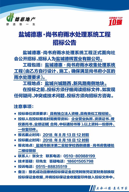盐城德惠·尚书府雨水处理系统工程招标公告