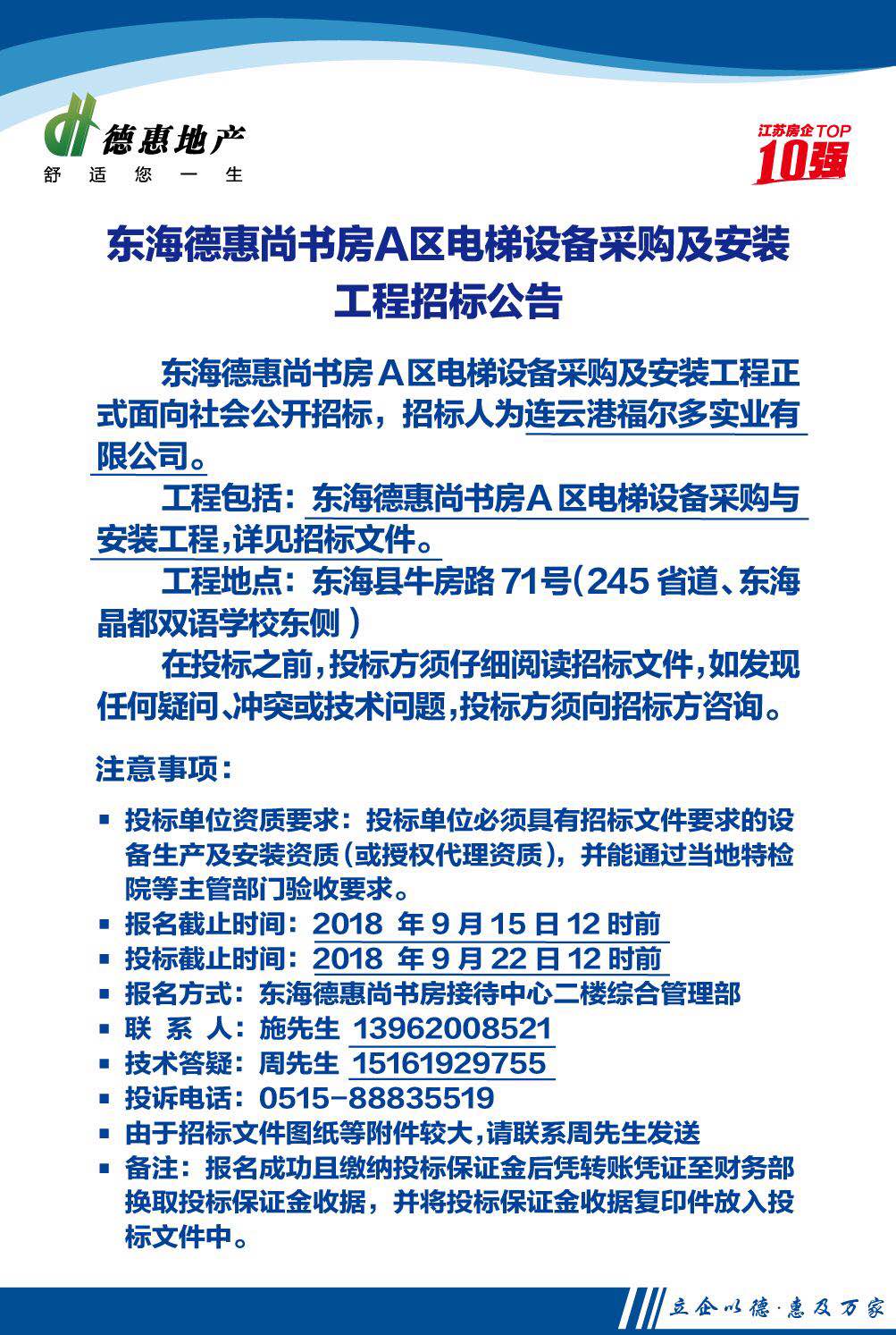 东海德惠尚书房A区电梯设备采购及安装工程招标公告