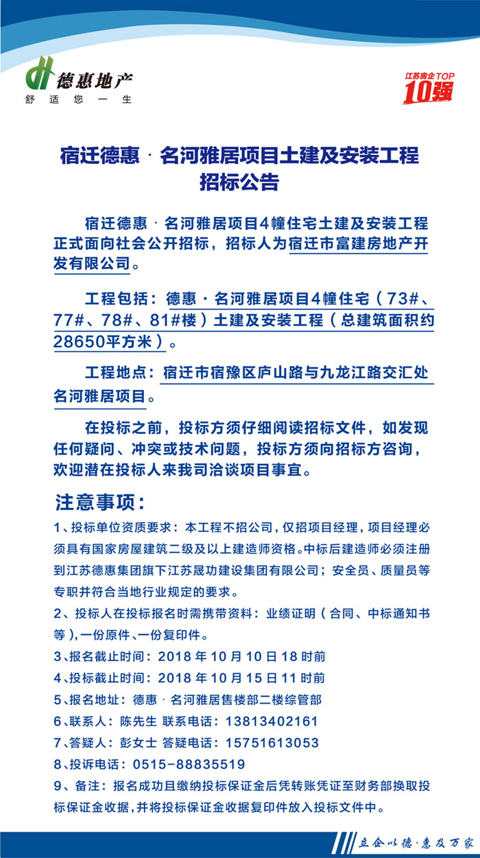 宿迁德惠·名河雅居项目土建及安装工程招标公告