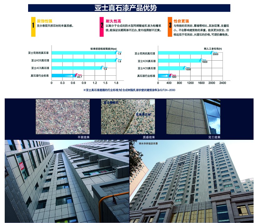亚士作为功能型建筑涂料的缔造者,在五彩缤纷的涂料世界,添加更多的功能满足建筑的各种需求,并帮助建筑结构解决各种技术难题。亚士率先解决了传统真石漆易泛白、易泛黄、附着力差的缺陷,亚士漆研发中心与瑞士花岗石材专家通力合作,反复研究花岗石的纹理,并成功地研制出能够逼真展现花岗岩纹理的新一代岩片状真石漆。它弥补了传统真石漆所缺少的岩石片状效果,大大提升了真石漆的应用价值。