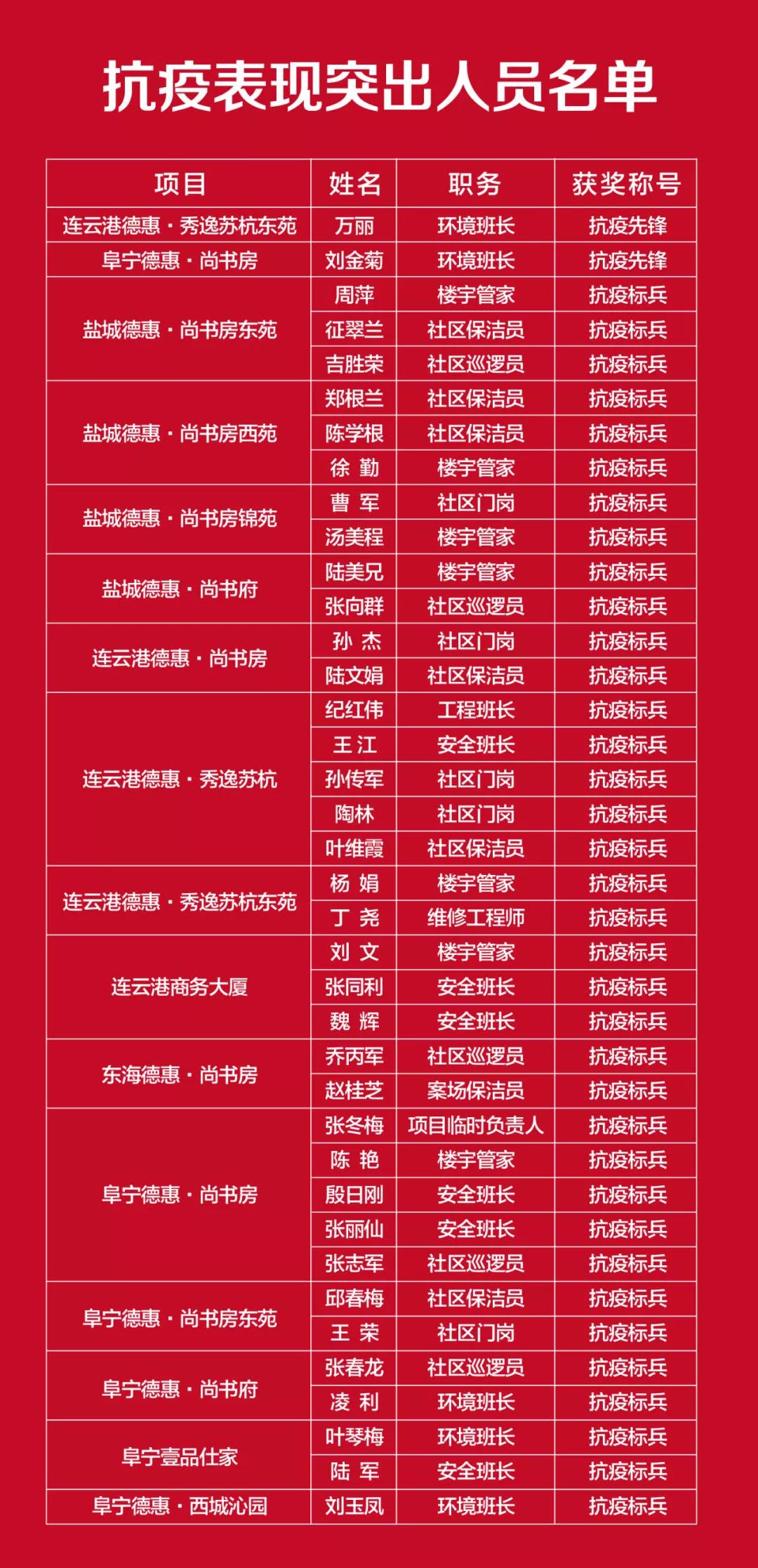 为更好地凝聚德惠物业及客服伙伴的力量,弘扬德惠物业及客服伙伴奋勇前行的精神,激发全体员工迎难而上、共克时艰的昂扬斗志,8月中旬德惠集团各区域项目召开了疫情防控表彰大会,通过各物业项目内部推荐及城运集团综合评估,评定出在疫情期间表现突出的员工:“抗疫先锋”2名,奖励2000元/人;“抗疫标兵”共计36名,奖励500元/人;同时对于2-3月份能坚守岗位的德惠物业及客服伙伴,发放特殊岗位津贴200元/人。 在此,德惠集团及全体伙伴,向你们在疫情期间的辛勤付出表示衷心的感谢,对你们的奉献精神表示最崇高的敬意! 德惠集团以你们为骄傲,向你们致敬! 祝健康平安、阖家幸福! |