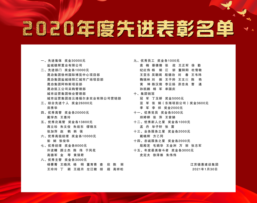 本次大会以“学标杆,拓视野,用数字之力加速奋进;行变革,强运营,集众人之智行稳致远”为主题,主要设“董事长作大会主题报告”、“2020年度先进表彰”、“关于内部组织机构设置及人事任命的通知”、“签订2021年度目标责任状”及“代表发言”五项议程。会上,集团党委书记、董事长朱文亮先生带领大家回顾了2020年,在肯定成绩的同时也深入思考,客观地剖析了发展过程中的不足,并就集团2021年的工作开展给出指导思想及具体办法。 董事长表示今天的成绩,离不开各级党委政府对集团事业发展的正确领导,离不开社会各界朋友的大力支持,离不开每一位德惠人的艰苦奋斗,是全体同仁齐心协力、无私奉献、团结拼搏的成果。2020年,集团始终坚持认真学习贯彻习近平新时代中国特色社会主义思想和党的十九大、十九届二中、三中、四中、五中全会及中央经济工作会议精神,围绕“卓越城市服务者”的战略定位,勇担社会责任,积极抗疫自救,集全员之力推动业务模式变革抓利润、探索数字化建设促赋能、对标标杆企业补差距、优化薪酬绩效体系强激励,最终实现了全年经济效益平稳推进。 董事长强调,面对新时代的发展考验和日益严峻的生存环境,2021年,德惠集团作为中小型企业,必须奋力一搏获得生存空间,紧握以人为核心的新型城镇化发展和跟随产业发展路径的市场机会,坚持以人民为中心的发展思想,向国家倡导的“使城市更健康、更安全、更宜居”迈进,打造宜居城市、韧性城市、智能城市,不断实现人民群众对美好生活的向往。 征途漫漫,惟有奋斗,2021年让我们在习总书记的睿智领导下,在全体伙伴的努力奋斗下,建立大运营的财务思维,提高客户满意的服务能力,打造匠心优质的精工产品,进一步扩大规模保生存,精简组织提效能,细化标准提品质,提升能力控风险,优化机制促激励,做到练好内功、注重人效、业务为先、聚焦赋能、高效激活,用活数字之力,强化组织驱动,全面突破重围开启2021新篇章。 |